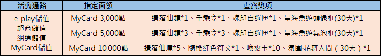 在活動期間內,至活動通路購買指定面額,並成功儲值進遊戲中,即可獲得相對應虛寶獎勵回饋呦!